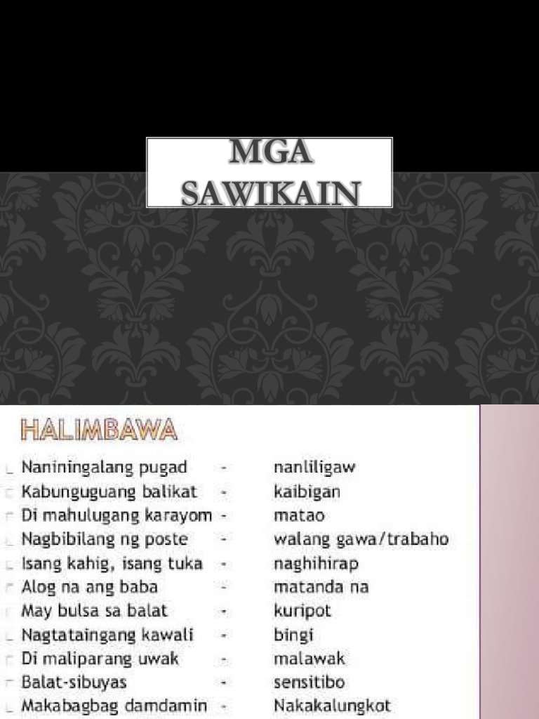 Ito ay isang pagpapahayag na ang ibig-sabihin ay hindi ang direktang kahulugan nito. At iyan nga po ang 205 mga sawikain o idyoma na aming kinalap pinagsama-sama at nilagyan ng mga halimbawa kung paano ito gamitin sa isang pangungusap o pahayag. Kung nakatulong sa iyo itong aming ginawang mga halimbawa ng sawikain mangyaring ibahagi sa iyong mga kaibigan o kamag-aaral upang maging sila ay matuto rin kagaya mo.