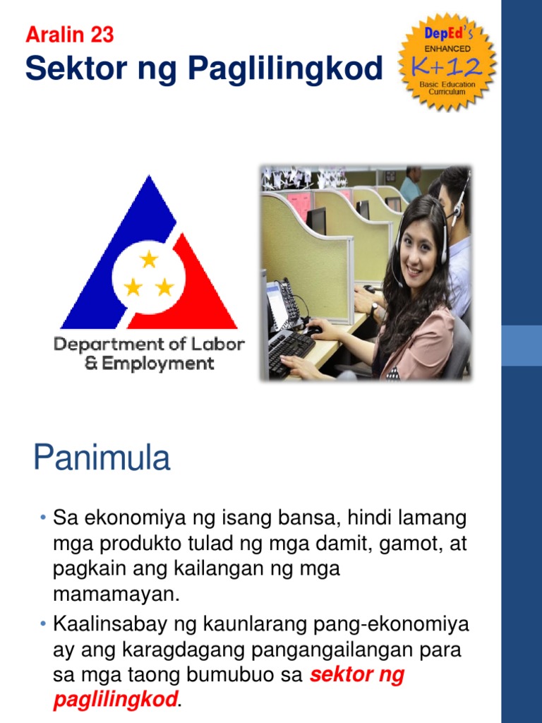 Ano ang mga bumubuo sa sektor ng paglilingkod. Iginigit nasabing kapasyahan ng KWF ang pagtuturo ng siyam 9 na yunit sa Wikang Filipino na hindi pag-uulit lamang ng mga sabjek sa Filipino sa antas sekundarya kundi naglalayong magamit at maituro ang wika mula sa ibat ibang disiplina-na pagkilala sa Filipino bilang pintuan ng karunungan at hindi lamang daluyan ng pagkatuto at upang. Full PDF Package Download Full PDF Package. Ang ilan sa mga halimbawa ng sektor ng paglilingkod ay ang mga sumusunod.
